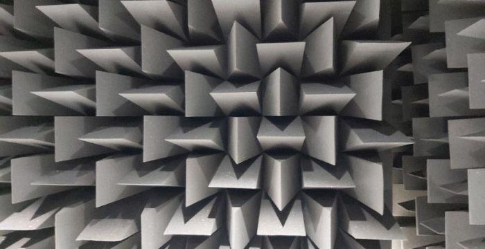 Paredes y techos flotantes a base de sistema metálico elástico (red de muelles específicos a las inercias del sistema), totalmente revestidos con un sistema de cuñas acústicas de tipo Wedge fabricadas en espuma flexible de poliuretano ignifuga de 25 kg/m3 de densidad, de 335×335 mm de base, 167 mm de altura de base, y 1.000 mm de altura total. El ángulo prescrito es de 23º y el área de absorción acústica que se consigue por unidad es de 0,84 m2 por unidad de cuña (i.e.; 7,6 m2 de área absorbente en 1 m2 de área de paramento de cámara; pared o techo). La frecuencia de corte fc derivada de dicha dimensión de cuña es de 85 Hz. Estas cuñas están contrapeadas para aumentar la superficie de absorción a los diferentes ángulos de incidencia del sonido y apuntando hacia el centro del recinto.Además de las cuñas, en la Cámara existen dos elementos acústicos en las dos paredes de menor dimensión de la Cabina que funcionan como trampas flotantes de bajas frecuencias sintonizadas a 80 Hz. Estos elementos están construidos con panel sándwich separados de la pared a 550 mm, con una longitud de cavidad interior y de ancho de entrada de ¼ de la longitud de onda de la frecuencia de 80 Hz, en cuyo interior se alojan unas columnas de un segundo tipo de cuña Estas cuñas (la Pieza 1 en la Ilustración 1) están fabricadas con el mismo tipo de material que las otras cuñas, pero por sus características está fabricada para trabajar la absorción de ondas de 80 Hz de frecuencia. Sus dimensiones son de 550×550 mm de base, 179 mm de altura de base y 1.072 mm de altura total. El ángulo es de 34,2º y el área de absorción acústica que se consigue por unidad es de 1,07 m2 por unidad de cuña.