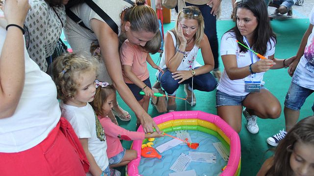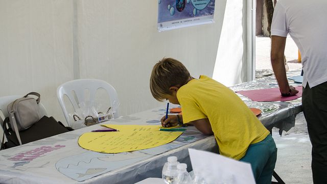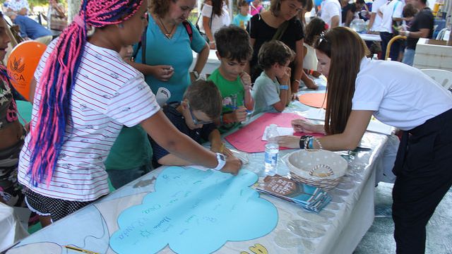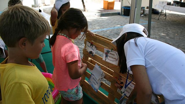 Los cuatro talleres integraron una dinámica interactiva. Los niños y niñas empezaban con el taller “Ola de términos” en el que tenían que escribir o dibujar distintas cartulinas con formas alusivas(a las profesiones del mar, los artilugios, los fenómenos metereológicos y los peces) nombres relacionados con el mar.