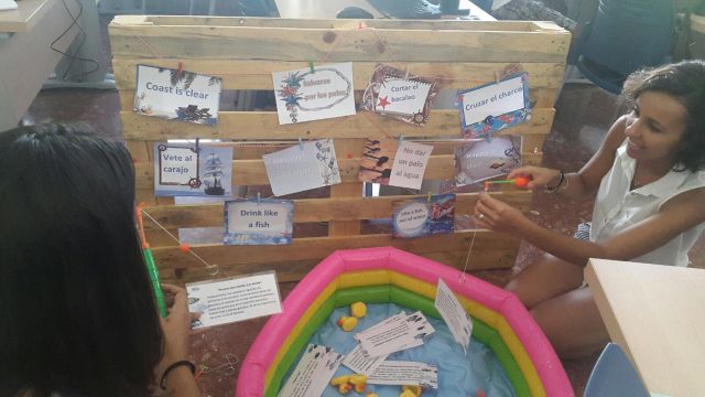 Después en el taller “¿Sabías qué?”, continuaban con la pesca, en una piscina de carteles, que incluían explicaciones de frases hechas y relacionadas con el mar, tanto inglesas como españolas, para juntarlas con expresiones que estaban en su palé.