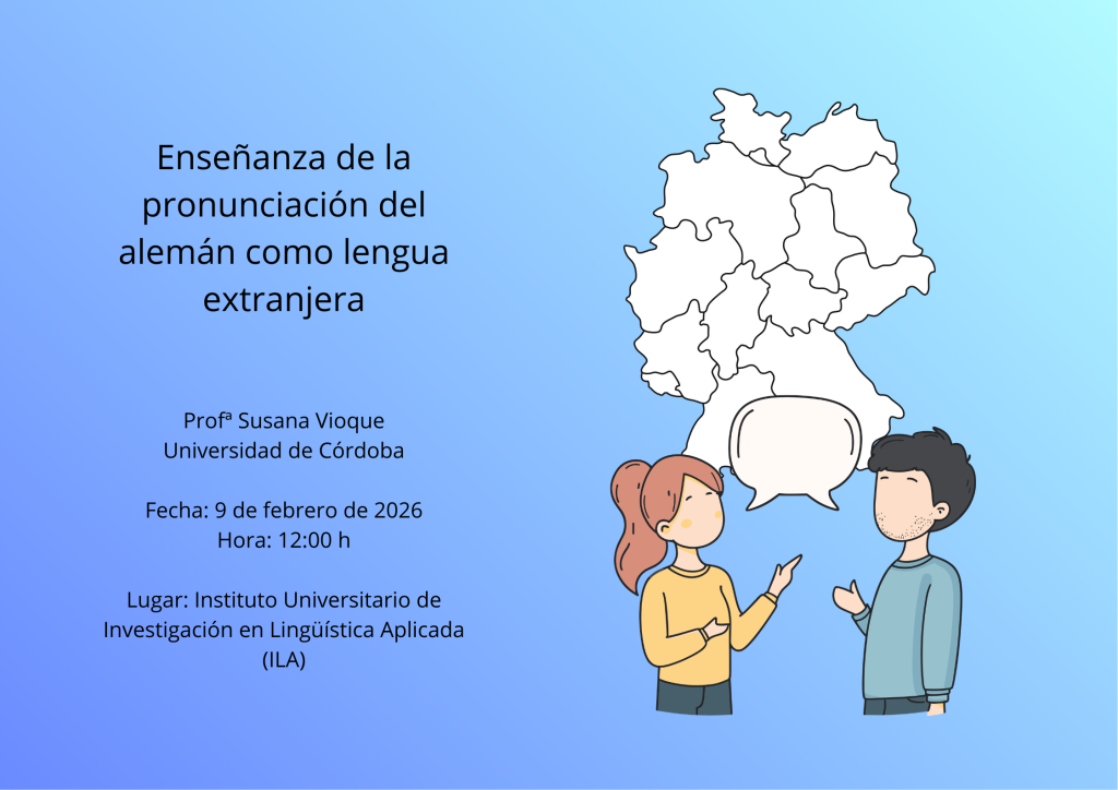 El próximo lunes, 9 de febrero, a las 12 h., tendrá lugar en el Instituto de Lingüística Aplicada, el seminario “Enseñanza de la pronunciación del alemán como lengua extranjera” a cargo de la profesora Susana Vioque, de la Universidad de Córdoba.